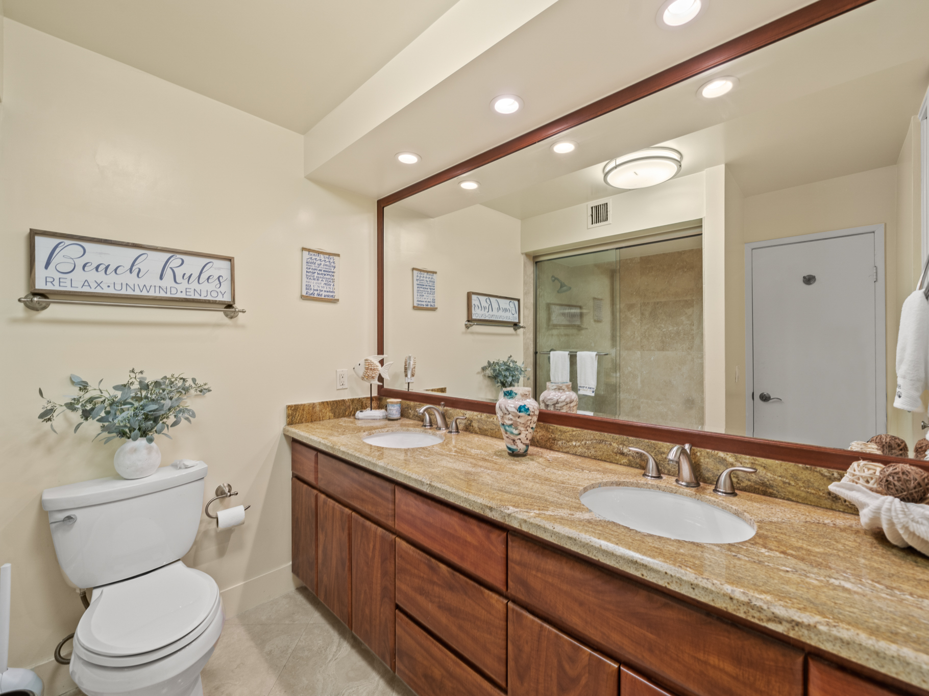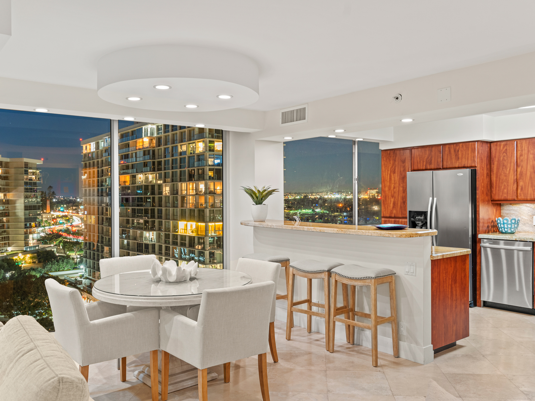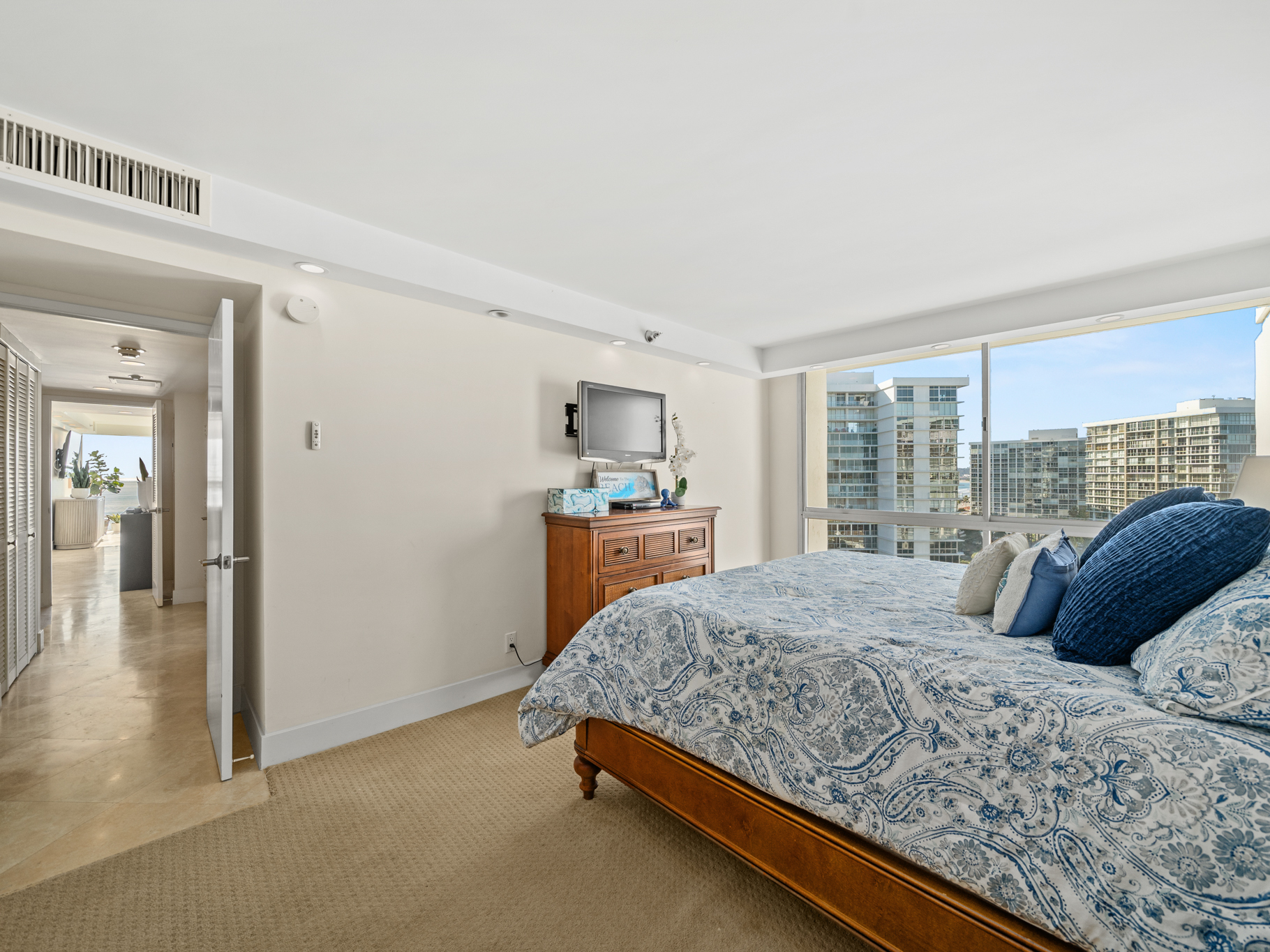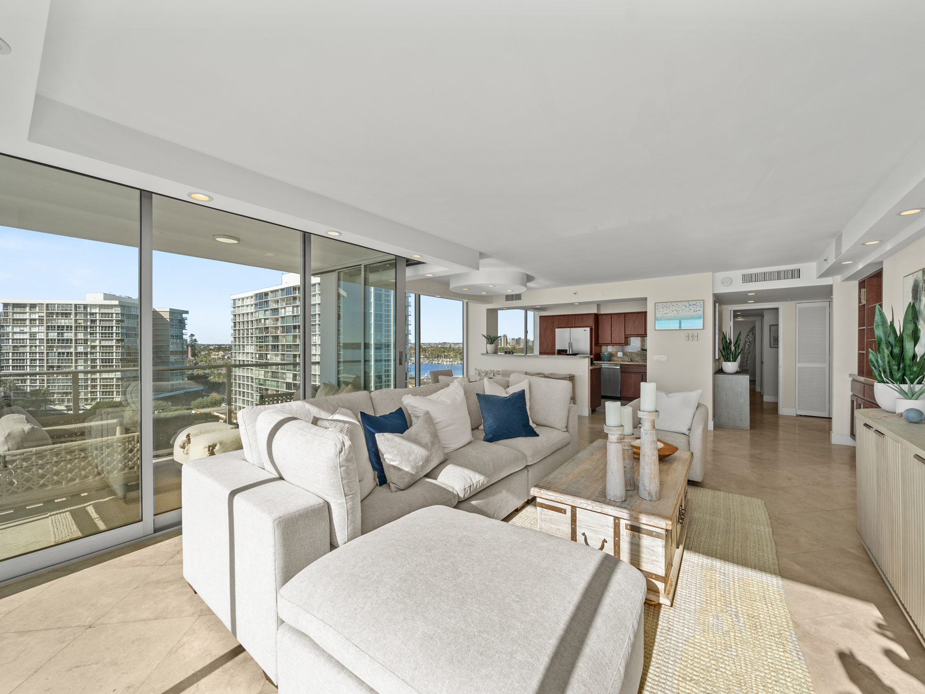Inside, the light-filled open floor plan feels warm and refined with timeless travertine flooring and granite countertops throughout, as well as a soft neutral palette. Expansive sliding glass doors create seamless indoor-outdoor living and open to a spacious private balcony, perfect for morning coffee, sunset dinners, or taking in the views.