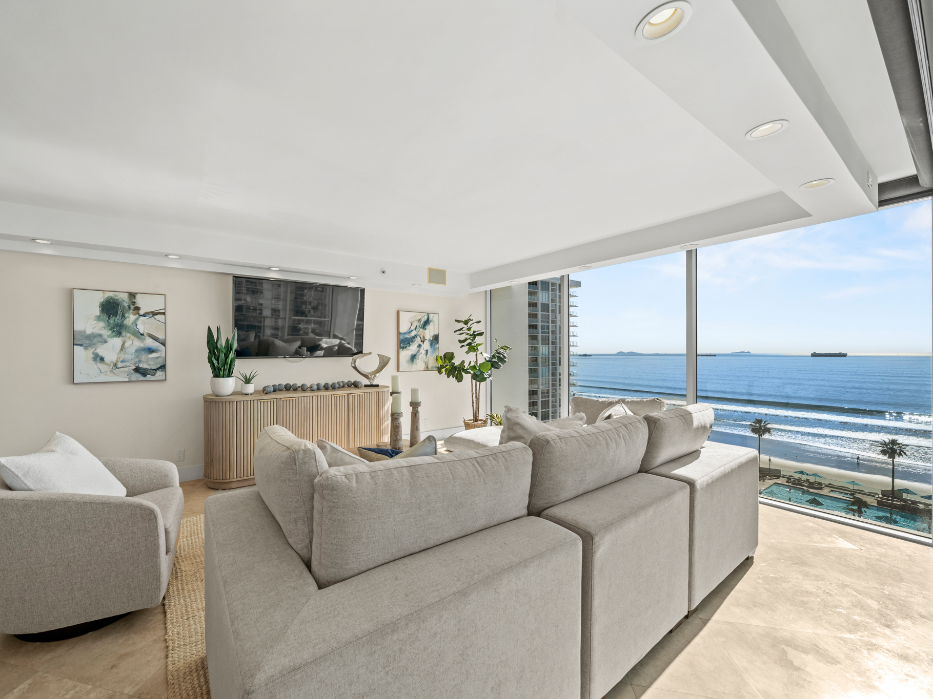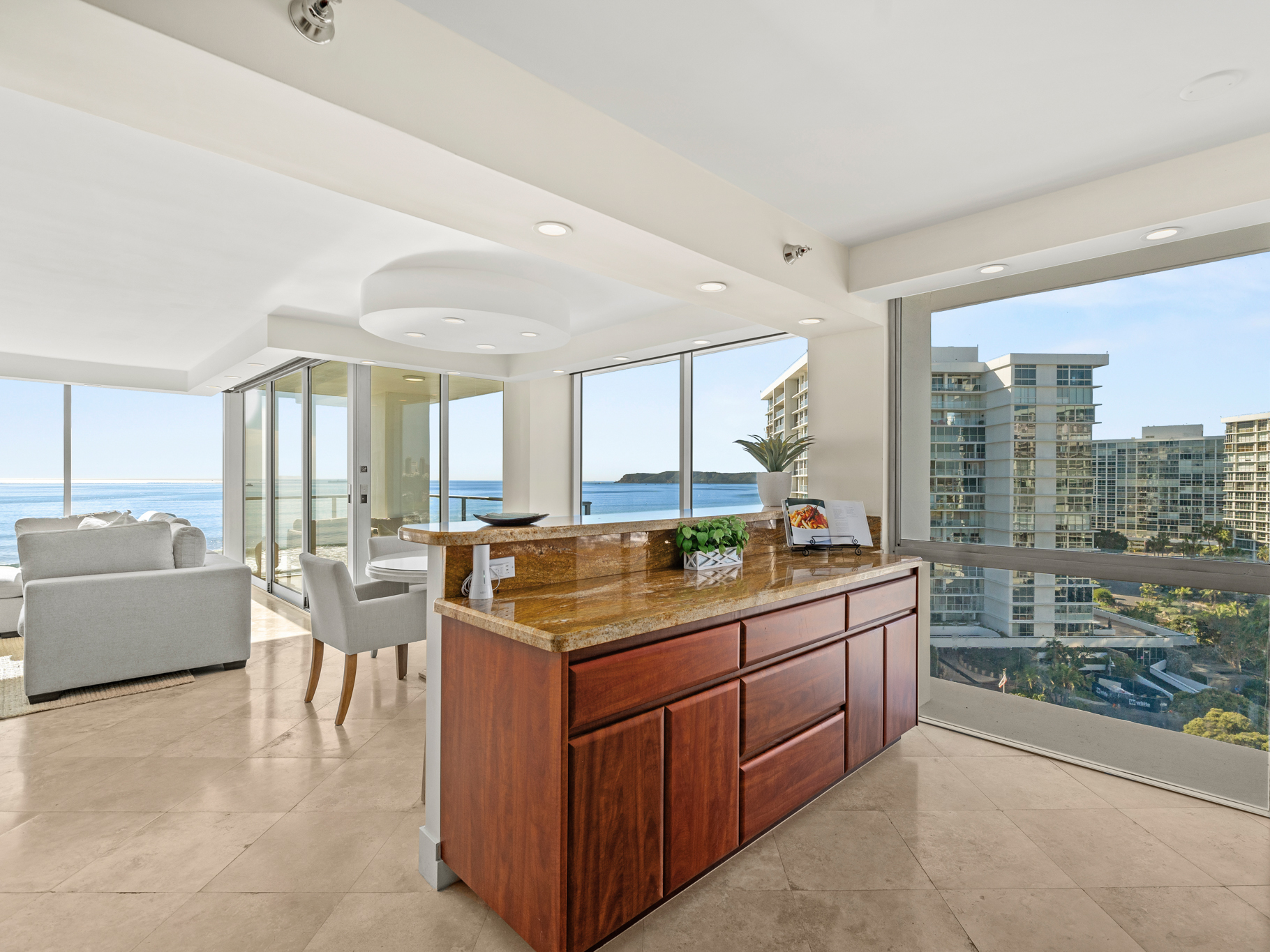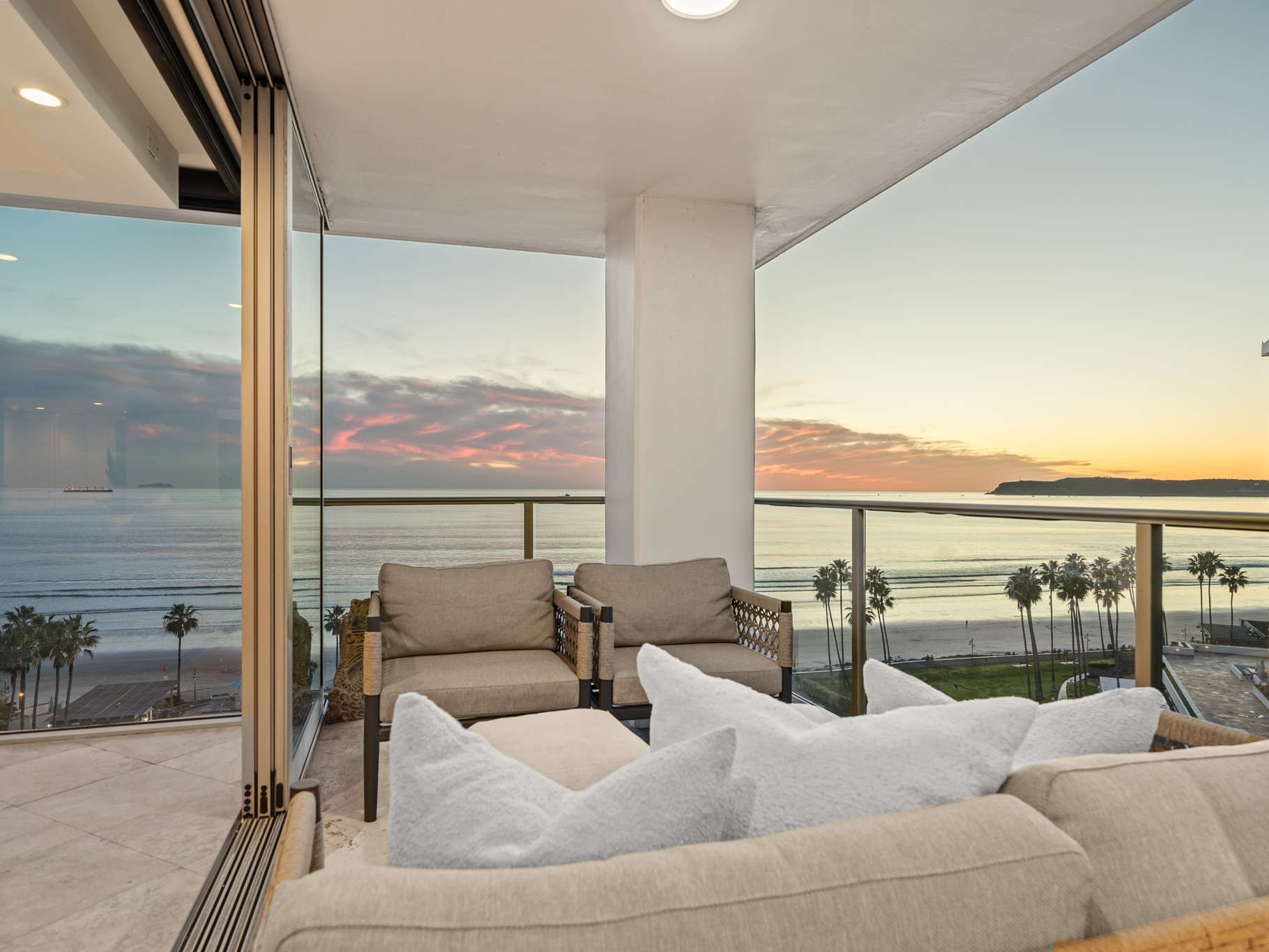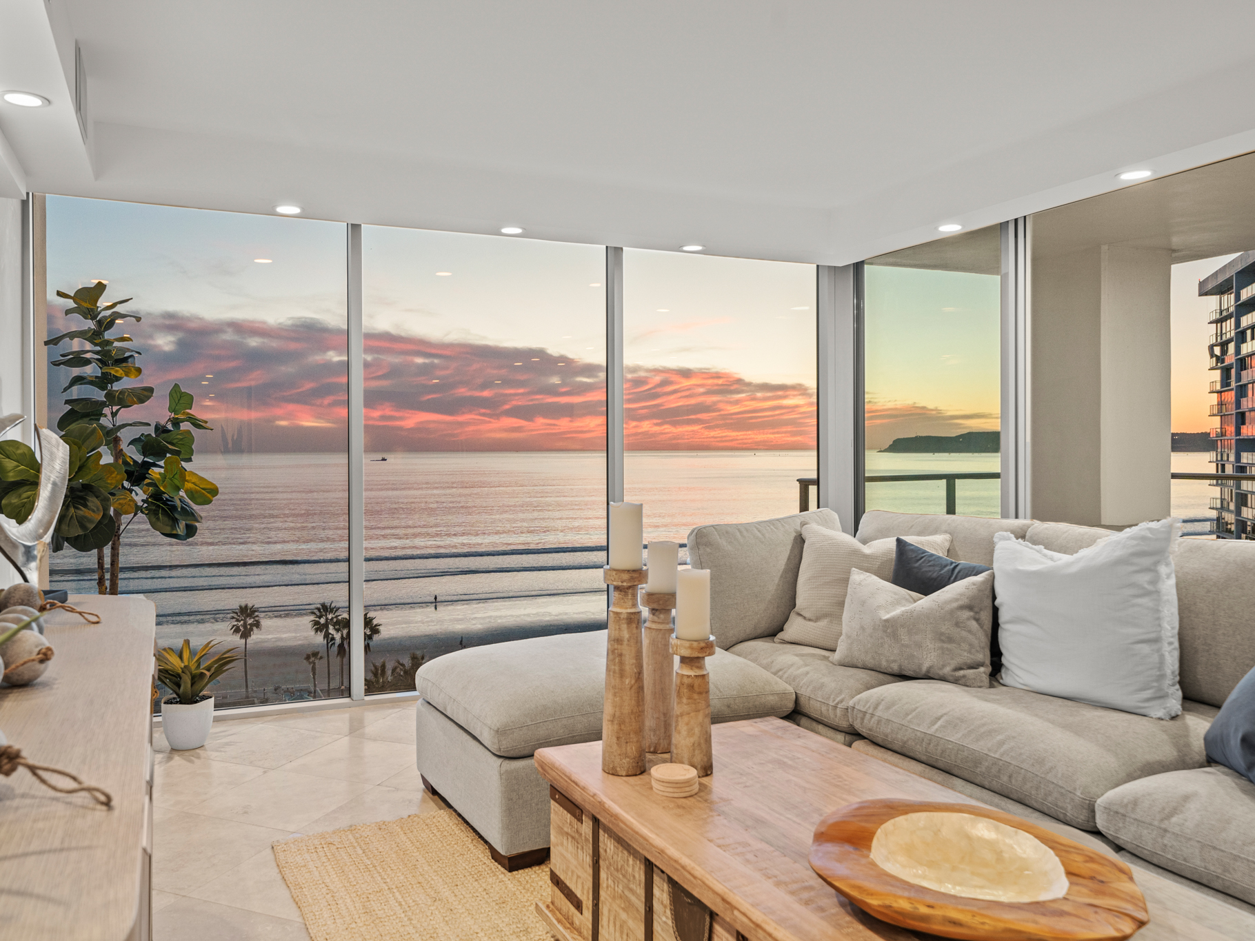 Situated on the 9th floor, this home captures sweeping Pacific Ocean views, Point Loma sunsets, and the San Diego Bay and downtown skyline, creating breathtaking scenery from sunrise to the city lights at night. Fireworks over the bay, glowing sunsets, and the sound of the waves become part of everyday life.